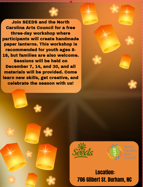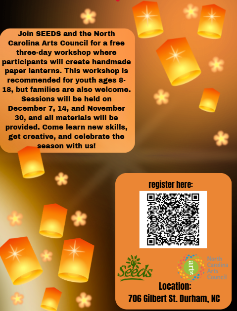 Join SEEDS and the North Carolina Arts Council for a free three-day workshop where participants will create handmade paper lanterns. This workshop is recommended for youth ages 8-18, but families are also welcome. Sessions will be held on December 7, 14, and november 30, 3pm-6pm and all materials will be provided. Come learn new skills, get creative, and celebrate the season with us!